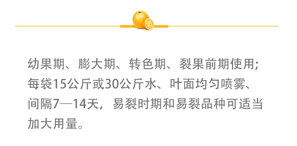 幼果期、膨大期、轉(zhuǎn)色期、裂果前期使用;每袋15公斤或30公斤水、葉面均勻噴霧、間隔7—14天,易裂時期和易裂品種可適當(dāng)加大用量。